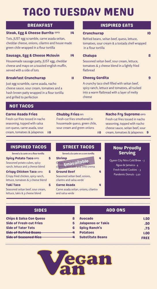 Vegan Van, a food truck specializing in vegan tacos, offers a wide range of options for plant-based enthusiasts. Located in Denver, CO, this Latinx-owned and women-owned establishment provides delivery, takeout, and even catering services. With a menu featuring Pescatarian and numerous vegetarian options, Vegan Van ensures inclusivity for all dietary preferences. Customers rave about the delicious food, such as the plant-based chalupas and the Stevie Chix sandwich. The friendly staff and quick service make ordering a breeze, whether online or in person. From the McLovin with tots to the Crunchwrap, each dish bursts with flavor and is a perfect choice for a quick vegan bite in the city. Don't miss out on experiencing the delectable offerings at Vegan Van.